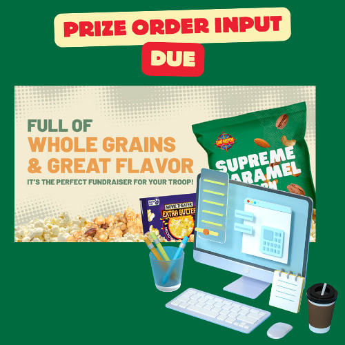 Complete the entry of Take Orders for your Pack or Troop. Entry must be completed by 11:00PM. Be sure to determine the prizes and/or patches to order from Keller Prize Program if your unit wants to participate.